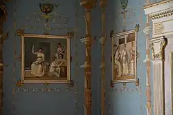 Der Saal 53, der gegenüber seiner ursprünglichen Form ebenfalls verkleinert wurde, enthält Porträts der Söhne von Ferdinando und Maria Karolina, mit denen Élisabeth Vigée-Lebrun beauftragt wurde, einen Wandteppich aus der Gobelinmanufaktur, der Don Quijote beim Fest von Barcellona, das von Don Antonio Moreno gegeben wurde zeigt, und an den Wänden vier „Konsolen“ mit vergoldetem Gürtel und militärischen Trophäen aus dem 19. Jahrhundert: Auf ihnen ruhen vier Vasen, die mit Statuettenpaaren, die den Herkules Farnese zeigen, gefertigt in Steingut von der Fabrik Del Vecchio.[57]
