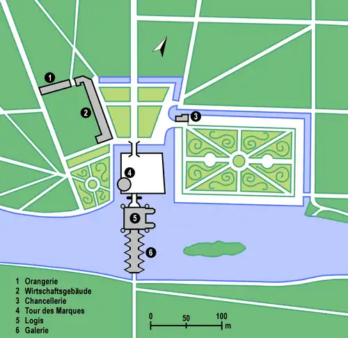 Eine etwa 330 Meter lange Platanenallee mit Wassergräben an den Seiten führt geradlinig auf ein Rasenparterre zu, dessen Eingangsbereich von zwei Sphinxstatuen aus der Regierungszeit Ludwigs XIV. flankiert wird. Sie stammen wahrscheinlich vom Schloss Chanteloup.[20] Dem Parterre schließt sich südlich eine von Wassergräben umschlossene Insel mit dem ehemaligen Bergfried der Anlage an. Von dort ist über eine Brücke das Hauptgebäude des Schlosses mit seiner sich anschließenden Galerie über den Cher erreichbar. Westlich der Allee befinden sich das ehemalige landwirtschaftliche Gut des Schlosses sowie die Orangerie.