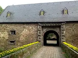 Eine 45 Meter[17] lange, siebenbogige Steinbrücke führt im Süden über den Schlossteich zum wuchtigen Torbau der Anlage. Die Bogenbrücke überspannt jedoch nicht die gesamte Wasserbreite, sodass ein letztes, kleines Stück von einer heruntergelassenen hölzernen Zugbrücke überwunden wird. Der quadratische Torturm besitzt drei Geschosse, die von einem achtseitigen, abknickenden Helm bedeckt sind. Dieser wurde nach einem Brand 1909 wiederhergestellt und besitzt eine geschlossene Laterne mit Uhr als oberen Abschluss.[5] Eiserne Maueranker an der Außenseite des Turms datieren ihn in das Jahr 1685, womit er das jüngste Gebäude der Schlossanlage ist. Weitere Eisenanker in Form der Buchstaben S G V H V Z G H Z W weisen Sebastian Graf von Hatzfeld und zu Gleichen, Herr zu Wildenburg als Bauherrn aus.[18] Über der rundbogigen Einfahrt mit einer von Spundquadern umgebenen Zugbrückenblende prangt in Stein das Wappen der Familie von Hatzfeld.