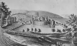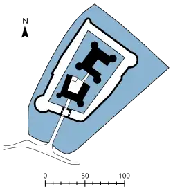 Das gesamte Schlossareal liegt inmitten eines 176 × 120 Meter[5] großen Schlossteichs und ist allseitig von einer Ringmauer mit Schießscharten eingefasst, die an der Südwest- sowie Nordost-Ecke bastionsartig ausgeformt ist. Ihr Rundbogenfries an der Außenseite markiert das Niveau des umlaufenden, überdachten Wehrgangs. Früher stand südlich des Teichs ein 1712 bis 1714 errichtetes, dreiflügeliges Wirtschaftsgebäude, das aber in der zweiten Hälfte des 19. Jahrhunderts wieder abgerissen wurde.[16]