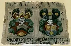 Über der Eingangstür befindet sich die Wappentafel von 1609. Sie enthält die Wappen der Sparnecker und von Truppach bzw. Mengersdorf als Doppelwappen. Das Sparnecker Wappen ist falsch tingiert, korrekterweise sind die Sparren in Silber und Rot.
