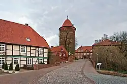 Von der hochmittelalterlichen Burg der Grafen von Dannenberg ist vor allem der Bergfried aus Ziegelmauerwerk bekannt. Der Rundturm erreicht eine Höhe von 33 m und besitzt einen Durchmesser von 12 m bei einer Mauerstärke von 2,30 bis 3,53 m. Den Hocheingang im 2. Stock erreicht man heute über einen Treppenturm, der im 18. Jahrhundert anstelle eines damals abgerissenen Gebäudes errichtet wurde. Die Burg war ursprünglich vollständig von einem 12 m breiten Wassergraben umgeben, von dem im Westen noch Reste vorhanden sind.