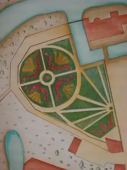 Das aus Broderieparterres gebildete Rondell im nördlichen Teil des Gartens bestand aus vier gleich großen Quartieren, die als Zierbeete angelegt waren. Die Einfassungen dieser Beete bildeten Stachel- und Johannisbeersträucher sowie Lavendel, Baldrian und Salbei.[23] In der Mitte des Rondells befand sich vermutlich eine größere Statue oder ein Brunnen als ein prägnanter Point de vue.[24] Dass die Zierbeete von Carl in vier Quartieren zu einem Rondell angeordnet wurden, ist auf die Lage des zur Verfügung stehenden Grundstücks zurückzuführen. Neben diesem Rondell hatte er für die südliche Ecke des Gartengrundstücks ein trapezförmiges, heute nicht mehr erhaltenes Tapis vert geschaffen, das als symmetrisches Beet zwei Akanthusornamente aufwies. Diese auch Boulingrin genannten einfachen Rasenflächen wurden für Ballspiele der herzoglichen Familie und ihrer Gäste benutzt.[24] Im gesamten Gartenareal, vor allem an den Enden der Alleen und in der Mitte des Rondells, waren insgesamt zehn Vasen, zwei große und 14 kleine Statuen sowie sechs Sitzbänke aus Stein aufgestellt.[24] An einem Teil der Gartenmauer, die zugleich die Stadtmauer bildete, waren Weinstöcke gepflanzt. Am 16. März 1693 spazierte Christiane von Sachsen-Merseburg das erste Mal durch ihren Lustgarten.[24] Während des Aufenthaltes von Herzogin Henriette Charlotte im Schloss Delitzsch betreute der Schlossgärtner J. M. Purths die barocke Grünanlage.[25]