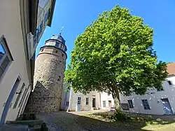 Das älteste Bauteil des Schlosses ist der 43 Meter hohe Turm an der Nordseite, der einen Durchmesser von 11,60 Meter aufweist. Im unteren Bereich hat er eine Wandstärke von 3,5 Metern. Er besteht bis in eine Höhe von 16,5 Metern aus Granitquadern. Darauf folgt, über einem Gurtgesimse, ein zwölfseitiges Geschoss aus Backsteinen. Dem folgt ein gleichartiges, aber zurückspringendes Stockwerk aus Fachwerk, aus der Zeit um 1660. Der Turm ist durch eine ausgeschweifte, zwölfeckige, schiefergedeckte Haube mit zierlichen Erkern und einer Wetterfahne bekrönt. Angeblich geht das Bauwerk in seinem Kern auf die Zeit zwischen 980 und 1030 zurück, wobei es keine Belege für die Existenz der Burg zu diesem frühen Zeitraum gibt.
