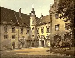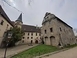 Hofseitig im Südflügel befindet sich ein Portal mit einer von Fabeltieren gehaltenen Inschriftentafel, die auf den Bauherrn und das Jahr 1622 verweist. Dieser Flügel entstand in zwei Bauphasen bis 1624. Der westliche Flügel wurde ebenfalls im Laufe des 17. Jahrhunderts errichtet und erhielt in der Umbauphase nach 1878 ein qualitätvolles Portal mit toskanischen Säulen und gesprengtem Giebel. In der südwestlichen Ecke des Hofs befindet sich darüber hinaus ein Scheintreppenturm, der im 19. Jahrhundert entstand.