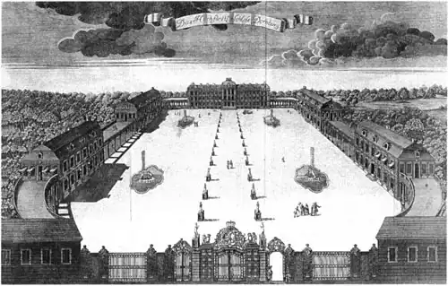 Das dreigeschossige Corps de logis war über begehbare Säulenkolonnaden mit vier zweigeschossigen Pavillons und der Toranlage verbunden. Zentrum der Anlage ist das errichtete monumentale Corps de logis mit 19 Fensterachsen und den drei Hauptachsen des Mittelrisalits. Entsprechend der Bauaufgabe eines „maison de plaisance“, bzw. „retraite“ ist deren Disposition mit entsprechenden französischen Schlossanlagen zu vergleichen. Das Corps de Logis ist auf den als Festplatz konzipierten Hof ausgerichtet. Der Zugangsweg in Mittelachse der Schlossanlage wird durch eine Allee von 26 kolossalen Statuen flankiert. In Mittelachse jedes der vier Pavillons ist eine Fontäne in ovalen, aus geschweiften Bögen zusammengesetzten Becken disponiert, welche mit Skulpturen nach Fabeln von Jean de La Fontaine und auf Delphinen reitenden Putten ausgestattet sind.