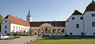 Das Schloss erhielt seine heutige Gestalt weitgehend im 18. Jahrhundert. Es ist ein dreiflügeliger Bau aus annähernd gleich langen Trakten, die Hauptfassade ist auf den Hof ausgerichtet und wird in ihrer Mitte von einem drei Fensterachsen überspannenden Segmentgiebel betont. Die rückwärtige Fassade in Richtung des früheren Barockgartens ist nahezu schmucklos, die westliche Fassade wird von zwei turmartigen Pavillons flankiert und ist mit einem Dreiecksgiebel geschmückt. Durch Erweiterungen an der in Richtung Westen folgenden Anlage des Wirtschaftshofes ist diese zweite Schaufassade des Schlosses in der Neuzeit entstellt worden. Im Osten des Komplexes schließt sich die auf kreuzförmigem Grundriss errichtete frühere Klosterkirche an, die heute vom Gemeindefriedhof umgeben ist.