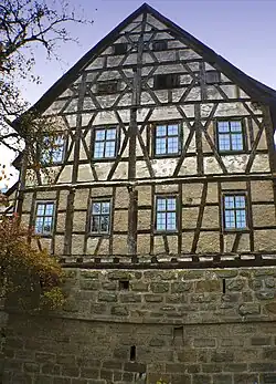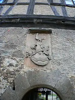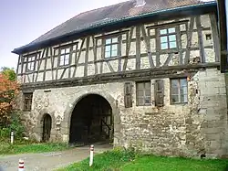 Ein Torhaus mit Fachwerkobergeschoss gewährt den Zutritt zum großen Ökonomiehof. Über dem Fußgängerportal neben der rundbogigen Toreinfahrt ist das Wappen der Herren von Rotenhan eingelassen.