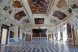 Die 24 Prunkräume des zweiten Obergeschoßes sind außen kranzförmig angeordnet. Das Programm der Deckengemälde umfasst ungefähr 600 Einzelszenen. Diese erzählen die damalige Vorstellung der Geschichte der Menschheit und der Welt. Sie beinhalten Szenen der Mythologie, religiöse Szenen des Alten Testaments und Szenen der Geschichte. Dieses Deckenprogramm mit dem rahmenden Stuck stammt aus der ersten Ausstattungsperiode des 17. Jahrhunderts. Die Stuckateure Alexander Serenio mit Sohn Josef Anton und seine Werkstätte wirkten von 1666 bis 1683.[3]