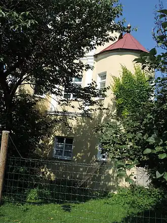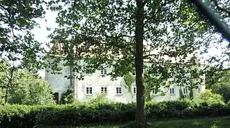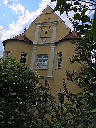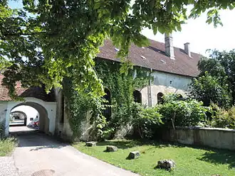 Im Jahre 1596 ließ Freiherr Ludwig III. von Grafeneck[1] eine prächtige Schlossanlage erbauen. Die Grafenecks, die 1664 in den Grafenstand erhoben wurden, verkauften 1723 das Anwesen an Fürst Anselm Franz von Thurn und Taxis. Das Wasserschloss war der Verwaltungssitz der Thurn und Taxisschen Besitzungen. 1810 wurde das Schlosshauptgebäude abgerissen. Heute existieren von der einstigen Anlage noch ein Stallgebäude, die ehemalige Ökonomie, ein Torhaus, ein Rundturm und das einstige Brauhaus. Letztgenanntes Gebäude wurde von Joseph Dossenberger erbaut. Es besitzt kirchenähnliche hohe Rundbogenfenster und die großen Innenräume sind kreuzgratgewölbt überdeckt.