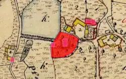 Es wird vermutet, dass im Hochmittelalter dort eine Turmhügelburg errichtet wurde. Die ehemalige Wehranlage wies noch im 20. Jahrhundert einen sie umgebenden Graben auf, der durch einen Wall geschützt wurde. Eine einstmals vorhandene Brücke über den Graben ist abgegangen.