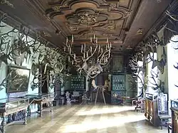 - Die Hirschgalerie – ein Prunksaal, der in seiner heutigen Gestalt 1864 entstand – und der Treppenaufgang zeigen die bedeutendste europäische Sammlung kolossaler, abnormer Geweihe.[8] Die Decke der Hirschgalerie (ca. 1685) wurde aus dem Prämonstratenserkloster Rot an der Rot dorthin verlegt.