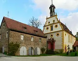 Der dreiflügeligen Anlage ist südlich und westlich ein großer Englischer Park vorgelagert. Im Norden und Osten stehen ausgedehnte Wirtschaftsbauten und Stallungen des 18. und 19. Jahrhunderts. Die Einfahrt in den Vorhof erfolgt von Osten durch ein rundbogiges Tor mit dem Rotenhanwappen. Die Umfassungsmauer wird durch zwei niedrige Rundtürme gesichert. Südlich der Einfahrt erhebt sich die große Schlosskapelle. Der rechteckige Sakralbau entstand 1685/86 nach einem Brand. An der Giebelseite gewährt ein repräsentatives Säulenportal mit dem Ehewappen Rotenhan-Erffa Einlass. Darüber bekrönt ein sechsseitiges Glockentürmchen die Fassade. Innen trägt eine spätbarocke Stuckdecke ebenfalls das Ehewappen Rotenhan-Erffa. Die Barockausstattung ist einfach, der Kanzelkorpus ist mit gedrehten Säulchen verziert.