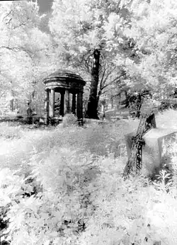 Einige Meter nordwestlich unterhalb der Ruine von Hinterfrankenberg befindet sich auf einer Terrasse der Privatfriedhof von Schloss Frankenberg, auf dem sowohl die Mitglieder der Schlossherrenfamilie von Pöllnitz als auch die Bediensteten begraben wurden. Das Zentrum des Friedhofs bildet ein mittlerweile baufällig gewordener klassizistischer Monopteros, der zurzeit wegen eines hölzernen Stützkorsetts kaum zu erkennen ist. Er soll demnächst abgebaut, restauriert und an gleicher Stelle wieder aufgebaut werden. Die Gräber der verstorbenen Familienmitglieder sind kreisförmig um den Rundtempel angeordnet.