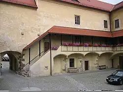 In den äußeren Schlosshof Schloss gelangt man durch zwei Wege: durch ein Tor am Hauptplatz und durch ein weiteres Tor am Ende der Schlossgasse von der Böhmergasse her kommend. Das Schloss war zusätzlich durch einen Graben und eine Zugbrücke gegen die Stadt und eventuelle Angriffe von dieser Seite gesichert. Selbst die angrenzenden Bürgerhäuser durften damals keinen Ausgang zum äußeren Schlosshof haben.
