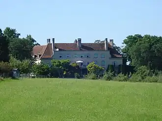 Eine hohe Mauer mit eingelassenem Tor und ein barockisierendes Pförtnerhaus, welches 1931 erbaut wurde, umgeben das Anwesen. Das Pförtnerhaus selbst hat ein auffallendes Teilwalmdach, mit apisartigem, zweigeschossigem Vorbau. Diese zwei Teile markierten die Zufahrt, welche alleeartig mit hohen Bäumen zum Eingang des Schlosses führt. Vor dem Schloss teilt sich die Strasse, um ringartig links und rechts des Einganges zu enden.