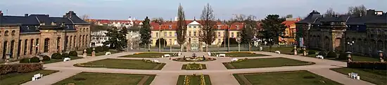 Gegenüber dem Schloss (auf der Westseite) wurde zur selben Zeit das Ordonnanzhaus errichtet, in dem die herzogliche Leibwache zu Pferd untergebracht war. Hinter dem Ordonnanzhaus entstand als Verbindung zum höher gelegenen Schloss Friedenstein eine terrassierte Gartenanlage mit Gewächshaus, welche die herzogliche Sammlung von Orangeriepflanzen beherbergte. Diese Ordonnanzgarten genannte barocke Gartenanlage (Vorläufer der heutigen Orangerie) war durch die Allee vor dem Siebleber Tor vom Schloss getrennt und architektonisch nicht auf dieses ausgerichtet. Die gesamte Anlage von Schloss, zugehörigem Lustgarten und Ordonnanzgarten ist durch einen sehr detaillierten Kupferstich von 1730 überliefert (siehe Bild).