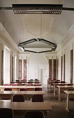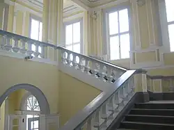 Im Mitteltrakt und dem nördlichen Seitenflügel (hier ist noch die auf quadratischem Grundriss erbaute großzügige Treppe mit schweren Balustern erhalten, die Wände des Treppenhauses sind mit ionischen Pilastern gegliedert, während die flache Decke eine einfache Kassettenteilung zeigt) lagen ursprünglich die herrschaftlichen Räume. Der Haupteingang des Schlosses befand sich in der Mittelachse des Gebäudes, die einstige Eingangshalle mit ionischen Wandsäulen ist inzwischen jedoch verbaut. Noch teilweise erhalten ist ein sich ursprünglich an die Halle anschließender achteckiger Raum mit Muschelnischen und Spiegelgewölbe. Das Obergeschoss des Mitteltrakts enthält in der Achse, der Straße zugewandt, einen großen Saal mit einfachen Deckenstuckaturen. Gartenseitig schließt sich eine Galerie an, die eine verkleinerte Kopie des Spiegelsaales von Versailles darstellte. Nach 1945 wurden jedoch die Spiegel sowie fast alle Wand- und Deckenstuckaturen entfernt, lediglich die Pilaster an den Wänden blieben erhalten. Von der Galerie führt ein Balkon mit zierlichem schmiedeeisernem Geländer zum einstigen Barockgarten auf der Ostseite des Schlosses. Einige Räume des Obergeschosses weisen noch heute Stuckaturen mit Engeln und Girlanden im Stil des Rokoko auf, die teilweise durch später eingezogene Zwischenwände unterbrochen sind.