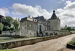 Im Inneren sind eine große Eichenholztreppe mit Balustergeländer vom Beginn des 18. Jahrhunderts und einige Stuckdecken im Stil des Louis-quatorze erhalten. Der große Saal im Erdgeschoss des Westflügels soll nach Plänen Johann Joseph Couvens gestaltet worden sein.[32] Er ist mit Parkett und einer Täfelung aus Eichenholz ausgestattet. Sein auffälligstes Einrichtungsstück ist ein marmorner Prunkkamin im Louis-quinze-Stil, dessen Abzug ein Gemälde mit der Darstellung der Göttin Diana zeigt.