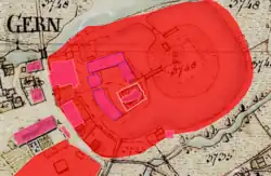 Nach dem Stich von Michael Wening von 1721 stand im Osten der Kirche in Gern ein mächtiges dreigeschossiges und vierflügeliges Wasserschloss. An den Ecken sind kleinere Türme erkennbar, an einer Seite steht ein zinnenbewehrter Turm; ein gleichartiger steht an der Brücke, die den Wassergraben von der Kirche in Gern überbrückt. Daneben ist die Rott zu erkennen. Die Anlage vermittelt einen wehrhaften Eindruck. Ebenfalls von einem Wassergraben umschlossen sind die Kirche von Gern und die daneben liegenden Wirtschaftsgebäude, auch diese waren nur über eine Brücke zu erreichen. Das „Alte Schloss“ zu Gern (das bereits 1648 im Dreißigjährigen Krieg von den Schweden zerstört, dann aber wieder aufgebaut wurde) wurde 1742 im Österreichischen Erbfolgekrieg zerstört.