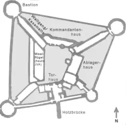 - Gefangenenhaus, Zeughaus und Kornmagazin des Westflügels sind heute nicht mehr vorhanden. Darauf entstand im 19. und 20. Jahrhundert der Komplex der Justizvollzugsanstalt
