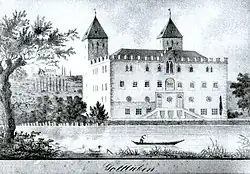Die ehemalige Wasserburg mit zwei Türmen wurde 1251 vom Konstanzer Bischof Eberhard II. von Waldburg erbaut, zusammen mit einer Holzbrücke über den Rhein. Damit wollte der Bischof der nahen Stadt Konstanz, mit deren Bürgerschaft er im Streit lag, Konkurrenz machen. Die beiden landseitigen Ecktürme des mittleren 13. Jahrhunderts bildeten zusammen mit dem 1346 dazugefügtem und 1352/1355 teilweise wieder zerstörten Palast, dem Ostflügel von 1434 bis 1446 und dem Nordflügel von 1475 bis 1491 eine mächtige, von einem Wehrgang umzogene Wasserburg.