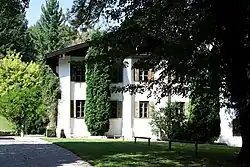 „Landhaus, zweigeschossiger Doppelgiebelbau in alpenländischen Heimatstilformen mit Zwiebelturm, Laube und verschalten Giebelfeldern, von Emanuel von Seidl über älterem Kern erneuert und erweitert, 1909–12.“