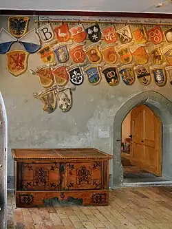 - 1. Obergeschoss: Seewärts befindet sich die sogenannte Landvogtstube, deren wuchtige Fenstersäule aus der Zeit des Wiederaufbaus von 1520 stammt. Das in spätgotischen Formen gehaltene Wandgetäfer, die Balkendecke und der Ofen wurden 1917 eingebaut. Daneben ist das Esszimmer mit einer vermutlich im späten 17. Jahrhundert bemalten Rankendenke und später eingebauten Schränken. Die Küche ist teilweise original, ein Tunnel im rund vier Meter dicken Mauerwerk diente als Vorratskammer.