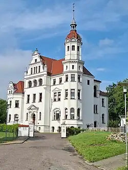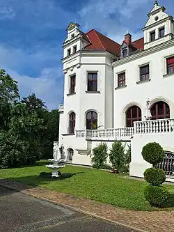 Das Haus wurde nach Brand des barocken Vorgängerbauwerks im Jahr 1895 nach einem Entwurf von Gotthilf Ludwig Möckel in den Jahren 1896–98 in den Formen der Neorenaissance für Friedrich Ferdinand Biermann erbaut. Der Sohn Werner Biermann verkaufte das Schloss 1926 an Hans Thyssen. Nach der Enteignung 1945 wurde es als Tuberkulose-Krankenhaus genutzt, danach seit 1948 vom Institut für Pflanzenzüchtung der DDR. Im Jahr 1982 entstand hoher Sachschaden bei einem Brand. Nach einer Teilsanierung war das Haus bis 2012 in Gemeindebesitz; seit 2012 wurde es privatisiert und 2014 außen saniert.[1]