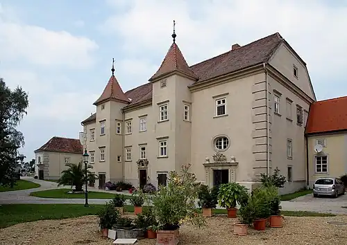 Im Zentrum der Schlossanlage steht das Herrenhaus, bestehend aus einem dreigeschoßigen Mitteltrakt mit Schopfwalmdach und sowohl östlich als auch westlich daran anschließenden, schmaleren Seitentrakten mit L-förmigem Grundriss. Die beiden Geschoße der Seitenflügel werden von einem Walmdach abgeschlossen, das auf einem profilierten Traufgesims ruht. Darunter verläuft in einigen Bereichen ein Fries, der aus Rauten und Rechtecken besteht.[7] Die Ecken der Trakte sind durch Eckquaderungen betont und heben sich vom hellen ockerfarbenen Anstrich des Gebäudes ab. Die heutige Gestaltung der Südfassade am Mitteltrakt geht wohl auf die Bautätigkeit nach der Übernahme des Anwesens durch das Stift Göttweig im 17. Jahrhundert zurück.[5] Sie wird von zwei schlanken der Fassade vorgesetzten Viereckstürmen dominiert, deren Mauerwerk nur wenig höher als das des Gebäudes ist. Ihre leicht abknickenden Helme in Form eines Zeltdachs mit bekrönenden Wetterfahnen besitzen sie erst seit den 1970er Jahren, als ihre damaligen Dächer mitsamt der beiden obersten Geschoße abgetragen wurden. Zwischen den beiden Türmen befindet sich in der Mittelachse des Hauses das Rechteckportal mit einer Verdachung auf Pilasterstümpfen. Es ist bei weitem nicht so aufwändig gestaltet wie das Portal der Schlosskapelle, die sich östlichen Teil des Mitteltrakts befindet. Die schräg gestellten Pilaster des Kapellenportals tragen eine Verdachung und die Wappen des Göttweiger Abts Johannes V. Dizent sowie des Stifts Göttweig. Darüber erhellt ein großes, querovales Fenster den Kapelleninnenraum.