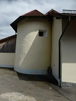 „Schlosstafel des ehemaligen Hofmarksschlosses Zweigeschossiger Rundling mit Pyramidendach, bezeichnet mit „1554“; Wappentafel mit Bauinschrift, Rotmarmor, bezeichnet mit „1554“.“