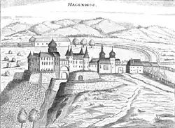 Gegen Osten war die Vorburg mit einem heute zugeschütteten Graben vom Hauptschloss getrennt. Die vier Ecken waren mit jeweils einem Rundturm bewehrt. Im ersten Stock der Vorburg befindet sich ein Arkadengang aus dem 16. Jahrhundert. Durch den Abbruch der Gruftkapelle ist der vorderste Hof frontseitig offen. Die Pfarrkirche ist als ehemalige Schlosskirche mit dem Südtrakt verbunden. Sie wurde 1610 als protestantisches Bethaus errichtet und 1672 und 1728 erweitert.