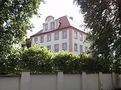 - Damals wurden die Erker abgetragen, das Satteldach durch ein Walmdach ersetzt und die Ostseite durch einen Zwerchgiebel mit geschwungenen Abschluss akzentuiert. Ein im Westen angebauter Risalit birgt das großzügige Treppenhaus. Im Obergeschoss wurde ein Saal eingerichtet und mit zarten Deckenstuck dekoriert.[1]