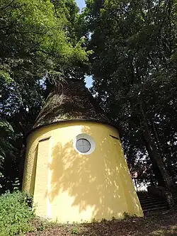 Das Schloss ist umgeben von einer in ihren Grundelementen aus dem 16. Jahrhundert stammen Einfriedungsmauer mit Türmen. Östlich der Schlossmauer befindet sich die kleine Rundkapelle.[3] Das zweigeschossige Amtshaus mit Mansardgiebeldach dürfte ebenfalls aus dem Jahre 1760 stammen. Weitere Ökonomiegebäude mit Walm- und Satteldachbauten kamen im 19. Jahrhundert dazu.