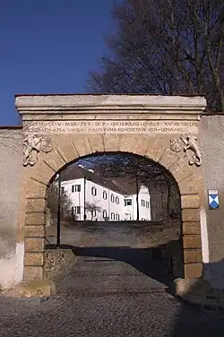 Am Parktor an der Herrengasse ist eine Inschriftentafel von Johann Baptist von Paar und seiner Ehefrau Afra, geborene Haim, mit der Jahreszahlen 1584 und 1598 erhalten geblieben. Sie stammt aus der abgetragenen Schlosskapelle.[3]