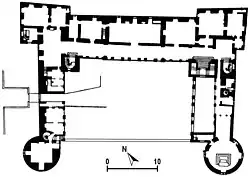 Von der mittelalterlichen Bausubstanz des 12. Jahrhunderts ist nichts mehr erhalten. Die ältesten Teile finden sich heute im Südwestturm, der auch Bretagne-Turm (französisch Tour de Bretagne) genannt wird. Sein Fundament stammt noch aus dem 15. Jahrhundert.[9] Sein Dachstuhl aus Kastanienholz trägt ein Kuppeldach mit abschließender Laterne. Von diesem Turm war der heute nur noch teilweise erhaltene Wehrgang erreichbar.[4] Sein Pendant am Ende des Nordosttrakts sieht zwar gleich aus, stammt aber zur Gänze aus dem 17. Jahrhundert.