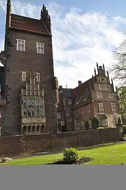 Für die Rekonstruktion der historischen Baugestalt standen neben alten Darstellungen Referenzgebäude aus Spätgotik und Renaissance zur Verfügung. Der Treppenturm im Schlossinnenhof ist nach dem Vorbild des Drostenhofs in Wolbeck gestaltet. Hier findet man auch die markanten Treppengiebel. Der Aufgang zum Hochparterre war lange Zeit als historistisch angesprochen worden. Andreas von Scheven hat 2010 nachgewiesen, dass die Renaissancetreppe am Lübecker Rathaus von den Bauherren als Vorlage genutzt wurde.[19] Im Höllinghofener Adelsarchiv der Familie von Boeselager findet sich noch eine Skizze des Lübecker Treppenaufgangs, gezeichnet von Engelbert von Kerckerinck zur Borg, der als Freund der Familie und sachkundiger Berater die Bauplanungen begleitet hat.