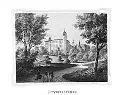 Rondell mit Kaminschlot sind auf einem alten schönburgischen Stammbaum,[26] der zwischen 1600 und 1760 entstanden sein muss (Original im Besitz des Museums Hinterglauchau), sowie auf einer weiteren alten Darstellung des Schlosses[27] abgebildet.[28] Eine weitere Abbildung findet sich auf der Gouache (Gemälde) von F. Wünschmann um 1840.[29] (oder um 1855[30]).