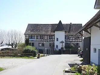 Der heute noch bestehende zweigeschossige Fachwerkbau mit einem Treppenturm[1] entstand um 1640. Das Wappen am Turm zeigt von unten nach oben die Wappen von Sürgenstein, Roth von Schreckenstein, von Liebenfels, von Coppenhagen und von Stuben. Der Vater von Engelbert von Syrgenstein wird als Obervogt zu Gaienhofen genannt. Besitzer des Renaissancebaus[2] waren die von Liebenfels, im 18. Jahrhundert werden die von Koppenhagen als Besitzer genannt.