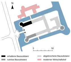 Der westliche etwa 30 × 9 Meter[15] messende Teil des Nordflügels ist hingegen noch vollständig erhalten. Seine zwei Geschosse sind an der grabenseitigen Außenmauer durch einen Backsteinfries voneinander abgegrenzt. Ein solcher fand sich einst auch an dem nicht mehr erhaltenen Herrenhaus.[16] Vermauerte Schießscharten zeugen von seiner einstigen Wehrhaftigkeit. Die Mauern seines runden Eckturms, der in seinem Inneren ein Kuppelgewölbe besitzt, sind 1,6 Meter dick.[16] Ehe der Flügel nach dem Zweiten Weltkrieg zu Wohnzwecken umgestaltet wurde, beherbergte er Stallungen und eine Remise.
