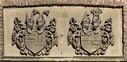 - DER WOHLEDELLGEBORNER JOHAN WILHELM VON NESSELRAD GENANDT HUGENPOET, FURSTLICHER PFALS-NEUBURGER HERR GEHEIMER RADT, CAEMMERER, LAND-COMMISSARIUS UND AMMANN ZUR BEYENBURG UND BEI (SO) WOHLEDELLGEBORNE ANNA ELISABETH VON NESSELRAD GENANDT HUGENPOET, GEBORNE DOCHTER VON UND ZU WEINCKELHAUSSEN, MERLO, KALCUM UND MORR, HABEN DEISSEM BAEU GEBAUVET VOR SICH UNND IHRE ERBEN ANNO 1647 DEN 17. JULIUS.