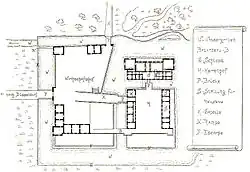 Der rechtwinkelige Südflügel wird an seiner Ecke durch einen rechteckigen, eingeschossigen Turm begrenzt. Es ist anzunehmen, dass dem Trakt, wie im Barock üblich, ein symmetrischer Nordflügel gegenübergestellt werden sollte, doch dieser wurde nie ausgeführt. Schießscharten im Mauerwerk geben einen Hinweis darauf, dass die äußere Vorburg unter Verwendung von Bausubstanz der alten Burganlage von 1509 errichtet wurde.