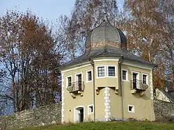 In der ehemaligen Umfassungsmauer des Schlosses befindet sich südlich ein in barockem Stil ausgebauter Eckpavillon mit Zwiebelhelm. Der Eckpavillon steht gemeinsam mit dem Schloss unter Denkmalschutz.