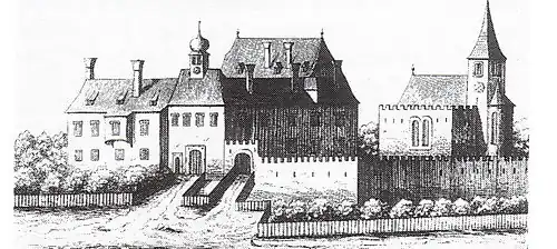 Das alte Schloss,[1] welches von den Rittern von Inzersdorf im 17. Jahrhundert erbaut wurde, war samt Kirche und dem sich hinter dieser ausbreitenden Friedhof von einem Wassergraben umgeben, über den zwei Brücken führten; die eine in das Schloss, die andere in die Kirche. Letztere stand so, dass der Turm in der Richtung gegen die Mühle sich befand.