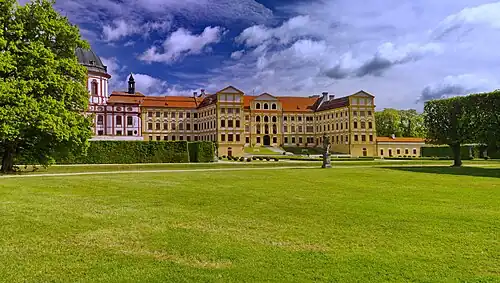 Das Schloss Jaroměřice nad Rokytnou gehört zu den größten mährischen Bauten der ersten Hälfte des 18. Jahrhunderts. Die ursprünglich mittelalterliche Festung wurde Ende des 16. Jahrhunderts zu einem Renaissanceschloss umgebaut, dessen Gestalt durch spätere Umbauten verloren ging. 1623 erwarb Wallensteins Vertrauter Gerhard von Questenberg auf dessen Vermittlung hin von Kaiser Ferdinand II. die Herrschaft Jarmeritz, welche zuvor einer Familie enteignet worden war, die zu den böhmischen Aufständischen gehört hatte; ein Jahr später erwarb er auch Petschau in Westböhmen.