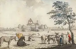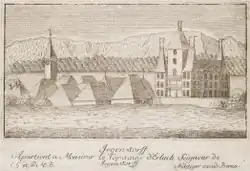 Albrecht Friedrich von Erlach verkaufte Herrschaft und Schloss Jegenstorf 1748 an seinen Sohn Karl Ludwig, nachdem er von seinem Vater Hindelbank übernommen hatte. Karl Ludwig von Erlach tauschte Schloss Jegenstorf, nun ohne Herrschaftsrechte, 1758 gegen eine Bodengülte und Nachgeld mit Anton Ludwig Stürler. Aus Stürlers Zeit haben sich zwei Gouachen des Schlosses Jegenstorf von Samuel Hieronymus Grimm erhalten.[12] Bereits 1765 verkaufte Anton Ludwig Stürler das Haus an seinen Bruder Johann Rudolf Stürler (1722–1784), genannt Mylord, der Gerichtschreiber und später Landvogt zu Köniz war. Seine Witwe Elisabeth Stürler–Mutach (1736–1818) war von 1784 bis 1789 alleinige Eigentümerin des Schlosses Jegenstorf. Ab 1789 war ihr Sohn Johann Rudolf von Stürler (1771–1861) Schlossbesitzer. Er erlebte die Märztage von 1798 im Schloss und berichtete später, dass sein reich gefüllter Weinkeller das Schloss vor weiterer Plünderung und Verwüstung durch die Franzosen verhindern konnte. Nach eigenen Angaben verkaufte er das Schloss 1812 aus finanziellen Gründen an seinen entfernten Cousin Rudolf Gabriel von Stürler.