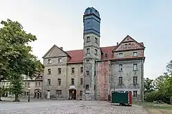 Die Schlosskapelle wurde bis 1870 für Gottesdienste genutzt. Der barocke Raum diente dann dem Ludwigsgymnasium als Turn- und Festsaal. Dazu wurde die Kapelle bis zur Höhe des Schlosshofes mit dem Aushub des neuen Gefängnisses aufgefüllt. 1961 bis 1963 wurde diese Auffüllung wieder entfernt und die ursprüngliche Raumgestaltung wieder hergestellt. Eine weitere Restaurierung erfolgte 1989 bis 1991. Die Emporenbrüstung mit vier Pfeilern – entworfen von Johann Michael Hoppenhaupt (1725) – stammt aus der Ruine der Dorfkirche Oberbeuna (Geiseltal), die mittlerweile zum Gemeindezentrum umgebaut wurde.[2] Die Orgel (von Johann Christoph Zuberbier) wurde ursprünglich um 1735 oder 1754[3] für die Kirche in Thurau geschaffen und 1986–1989 in der Schlosskapelle aufgebaut.