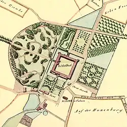 Der bestehende kleine Garten an der Westseite der Anlage wurde erheblich vergrößert und die westliche Mittelachse des Schlosses durch die Schlossallee bis nach Kaiserswerth verlängert. Für seine Umgestaltung zu einem englischen Landschaftsgarten kaufte Weyhe eine große Zahl verschiedener Baum- und Strauchsorten, zu denen Trauereschen, Trauerweiden, Rottannen, Akazien, Weymouthkiefern, Süßkastanien, Kanadische Pappeln, Holländische Ulmen und Rotzedern zählten.[113][114] Zu diesem Bereich des Schlossparks gehörten auch eine 1812[115] eingerichtete Kegelbahn, die auf der Pesch-Karte als kreuzförmiges Konstrukt im Südteil des Parks erkennbar ist, eine Schießbahn, die aus einem langen Wall mit abschließendem kleinen Hügel bestand, und ein bereits 1809[61] existierender Eiskeller am südlichen Parkrand. Auf einem durch den Schlossweiher-Aushub entstandenen Hügel wurde ein kleiner Tempel mit sechseckigem Grundriss errichtet, der von acht Säulen umstanden war und einen achtsäuligen Aufsatz besaß.[115][116]