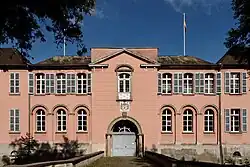 Der westliche Teil des Schlosses besteht im südwestlichen Bereich aus dem Herrenhaus mit Eckturm, seinem baulichen Pendant an der Nordwestecke der Anlage und einem Mittelbau, der die beiden Teile miteinander verbindet und zugleich das Hauptportal aufnimmt. Weil sich in diesem Bereich die Wohn- und Verwaltungsräume des Schlosses befanden, ist der über 100 Meter[96] lange Westteil besonders repräsentativ gestaltet und bildet die Schauseite. Dies äußert sich zum Beispiel darin, dass er verputzt und mit einem rosafarbenen Anstrich versehen und zudem höher als die Wirtschaftsbauten ist.