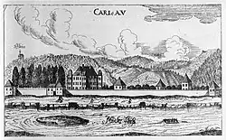 Das Schloss wurde von 1584 bis 1590 von den Architekten Marco Antonio Taddei aus Gandria, Tessin (CH) und Antonio Marmoro aus Ponna, Val d‘Intelvi (I) für den Erzherzog Karl II. als Jagd- und Lustschloss und als dessen Sommersitz errichtet. Das Gebiet um das Schloss, das Marsch- und Sumpfland war, wurde nach dem Namen des Regenten „Karl-Au“ benannt. Ursprünglich sollte das Schloss den Namen „Schloss Dobel“ erhalten. Dies führte aber zu Verwechslungen mit dem Jagdschloss „Tobel“ beim Dorf Dobel, das südöstlich von Graz liegt.[1] Nach dem Tod Karls II. war das Schloss der bevorzugte Sitz seiner Witwe Maria, die am Gebäude Erweiterungsarbeiten durchführen ließ.